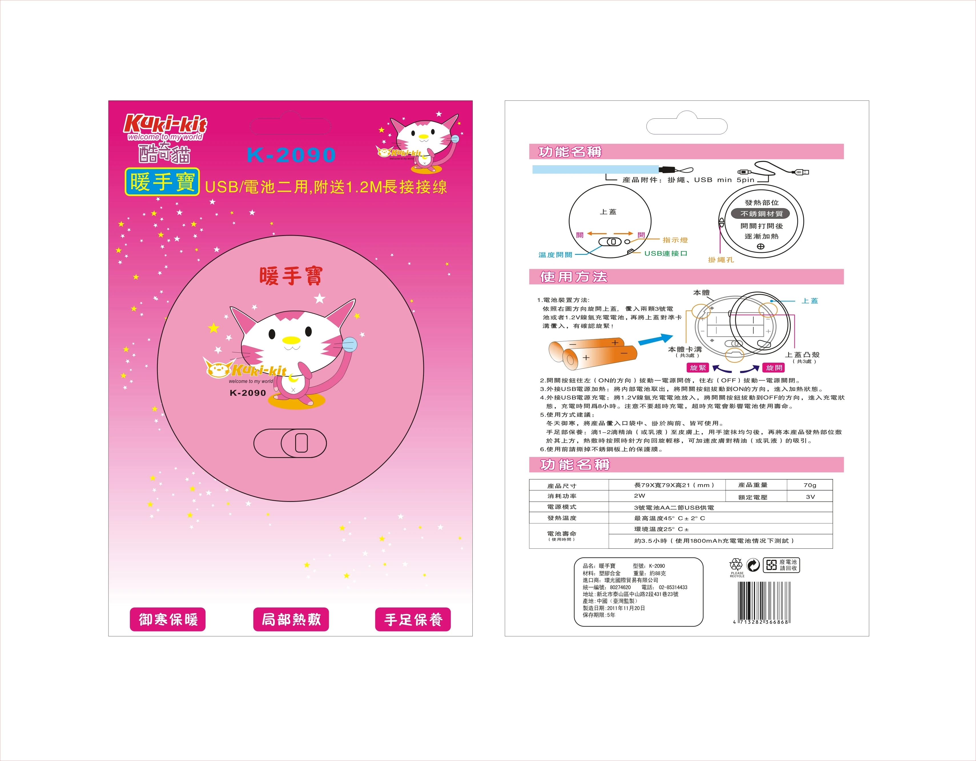 規格1.外形尺寸79*79*21mm材質:ABS環保2.配件::暖手寶+USB線+掛繩+彩卡+說明書產品特色1.核心加熱元件為金屬加熱膜,加熱速度快,熱效率高。2.供電源源可為充電鎳型氫電池或普通5號